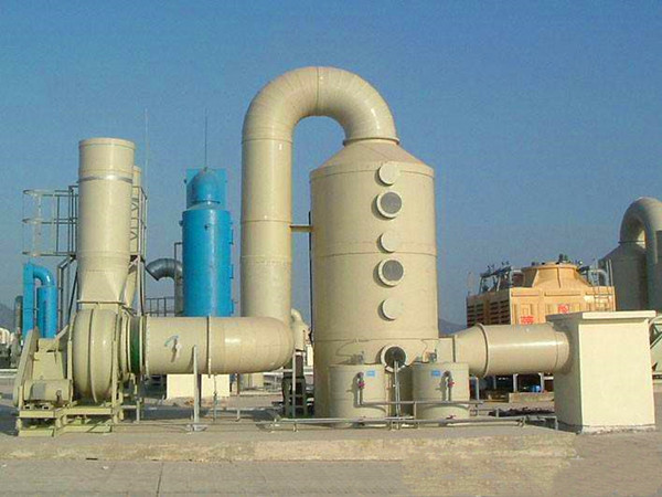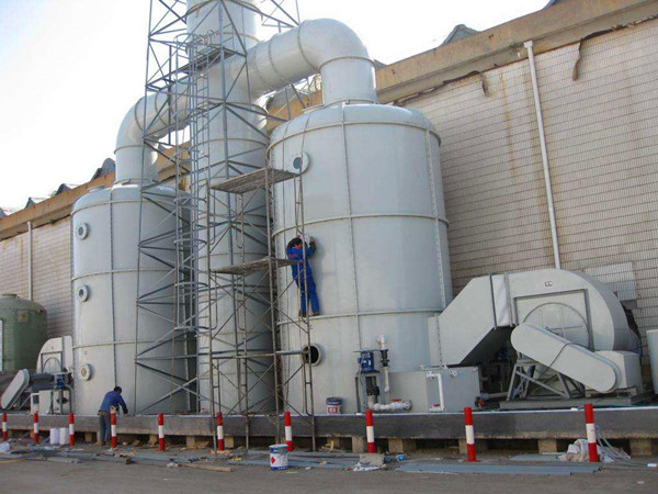 上圖為安裝完按成的廢氣處理工程,其中包括玻璃鋼離心風機、廢氣處理塔、循環水箱以及通風管道。