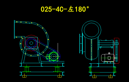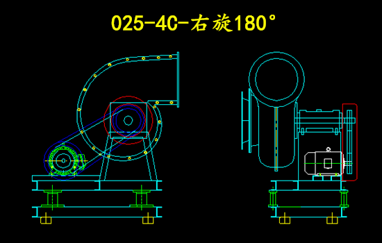 上圖為右旋180°的025-4C風(fēng)機(jī),人站在電機(jī)端正視風(fēng)機(jī),風(fēng)機(jī)葉輪的出風(fēng)方向為順時針。