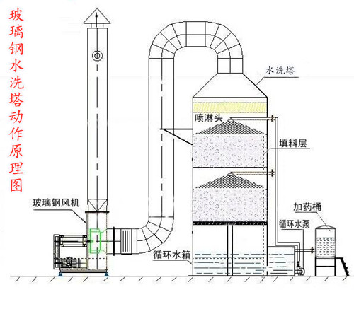 洗滌塔即將廢氣中的雜質清除,以煤炭燃燒廢氣處理為例,首先,廢氣有管道進入塔體底部,與由上至下的噴淋液體進行充分接觸,將廢氣中含有的灰塵過濾掉,流入底部的水槽內(nèi),氣體繼續(xù)往上走,根據(jù)廢氣量的大小選擇處理的次數(shù),經(jīng)過隔離層與形成膜狀的液體繼續(xù)清洗,如此反復,直至進入塔體頂部的除霧層,將氣體中含有的水分過濾之后,有管道經(jīng)由玻璃鋼離心式風機排出。